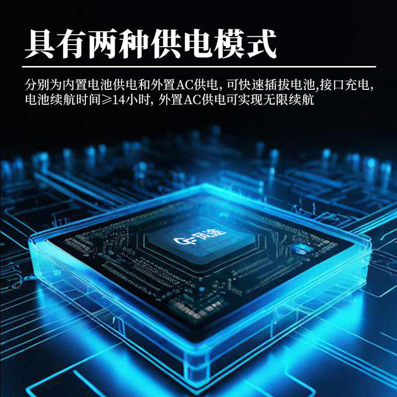 18、供电配置:供电箱具有两种供电模式,分别为内置电池供电和外置AC供电,供电箱可显示电池电量,可快速插拔电池接口充电,电池续航时间≥14小时,外置AC供电可实现无限续航。