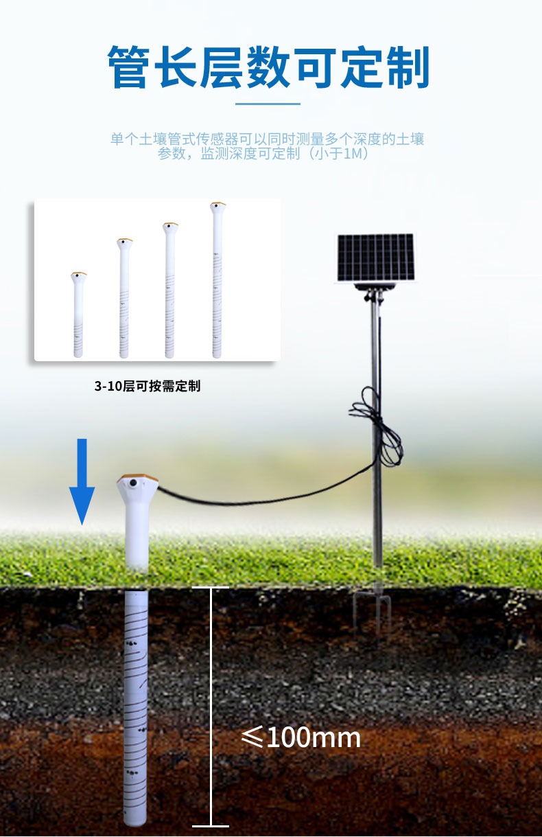 ★单个土壤管式传感器可以同时测量多个深度的土壤参数,监测深度可定制(小于1M)。