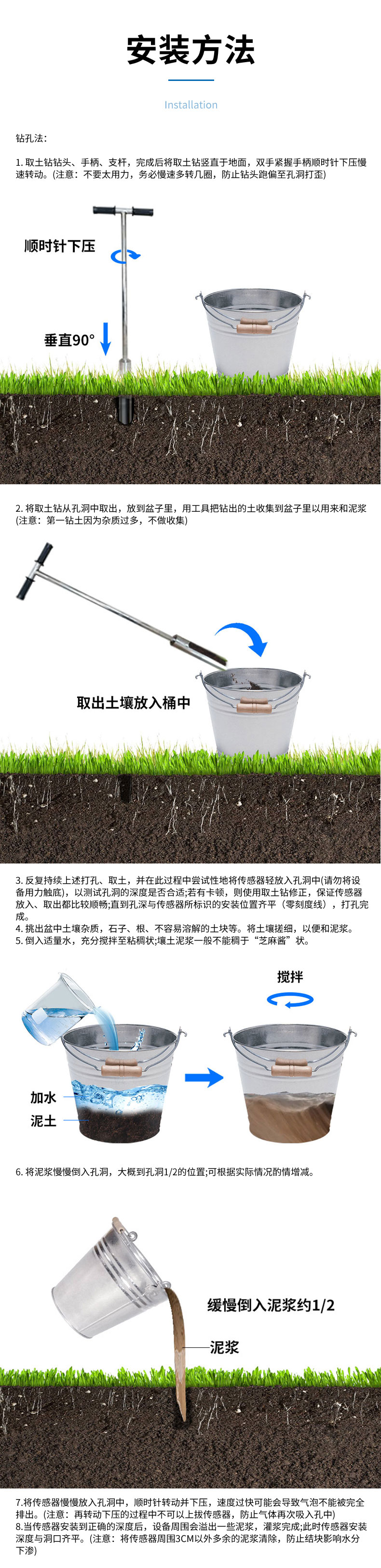 掩埋法:使用镐子挖一个埋传感器的深坑,和泥浆将传感器掩埋,处理细节参照钻孔法。
