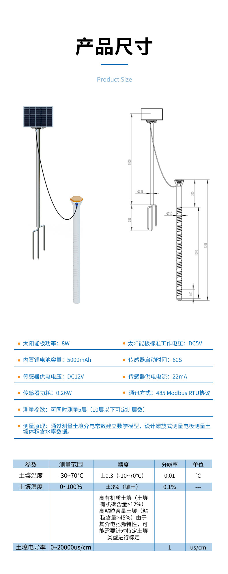 测量原理:通过测量土壤介电常数建立数学模型,设计螺旋式测量电极测量土壤体积含水率数据。