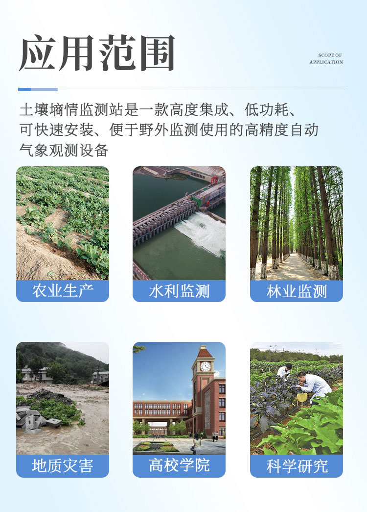 该设备支持有线、GPRS、蓝牙等传输方式,免调试,可快速布置,广泛应用于农业、林业、地质、高校、科研等方面。主要针对土壤水分含量、土壤温度、土壤电导率进行监测,通过水分传感器和温度传感器测量土壤的体积含水量(VWC)和温度值。同时,根据用户需求,可以扩展配置土壤PH、空气温度、空气湿度、太阳辐射、雨量等气象传感器。