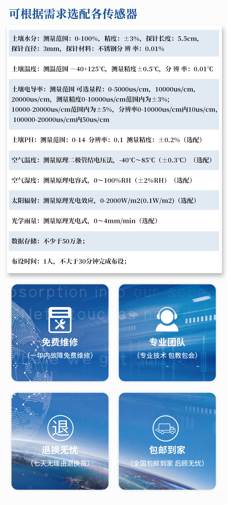 1)土壤水分:测量范围:0-100%,精度:±3%,探针长度:5.5cm,探针直径:3mm,探针材料:不锈钢