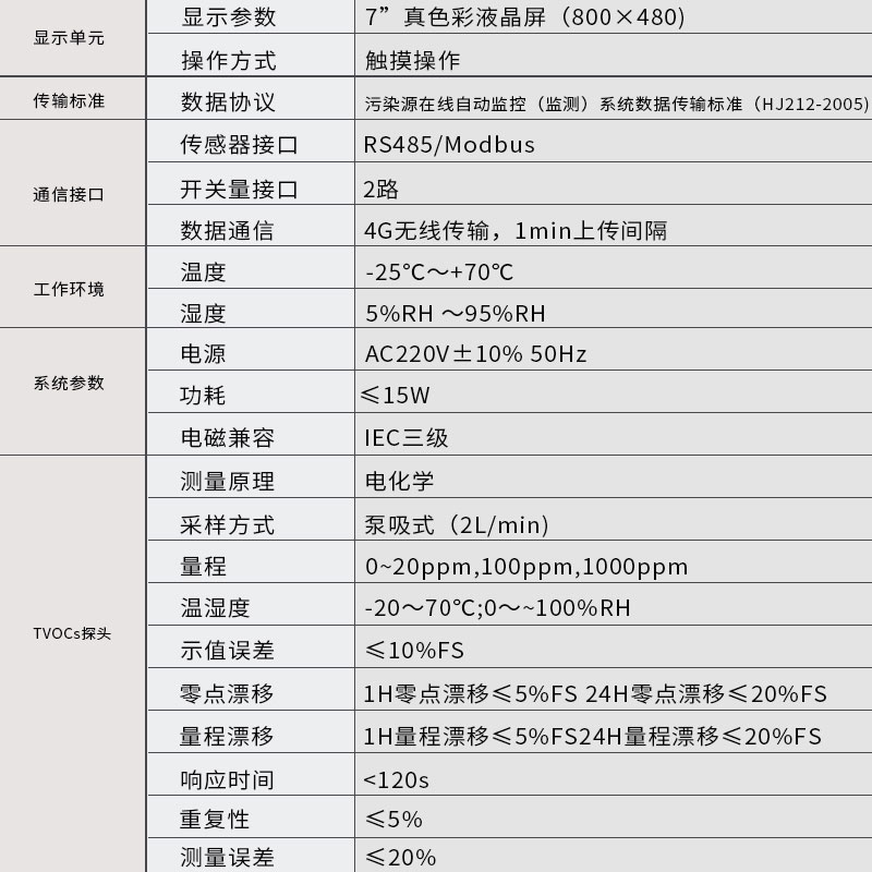 三、VOC在线监测仪产品参数