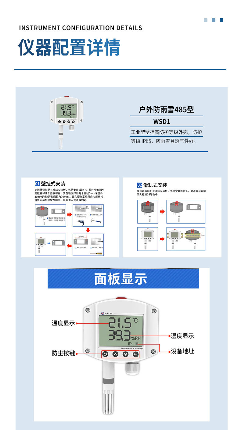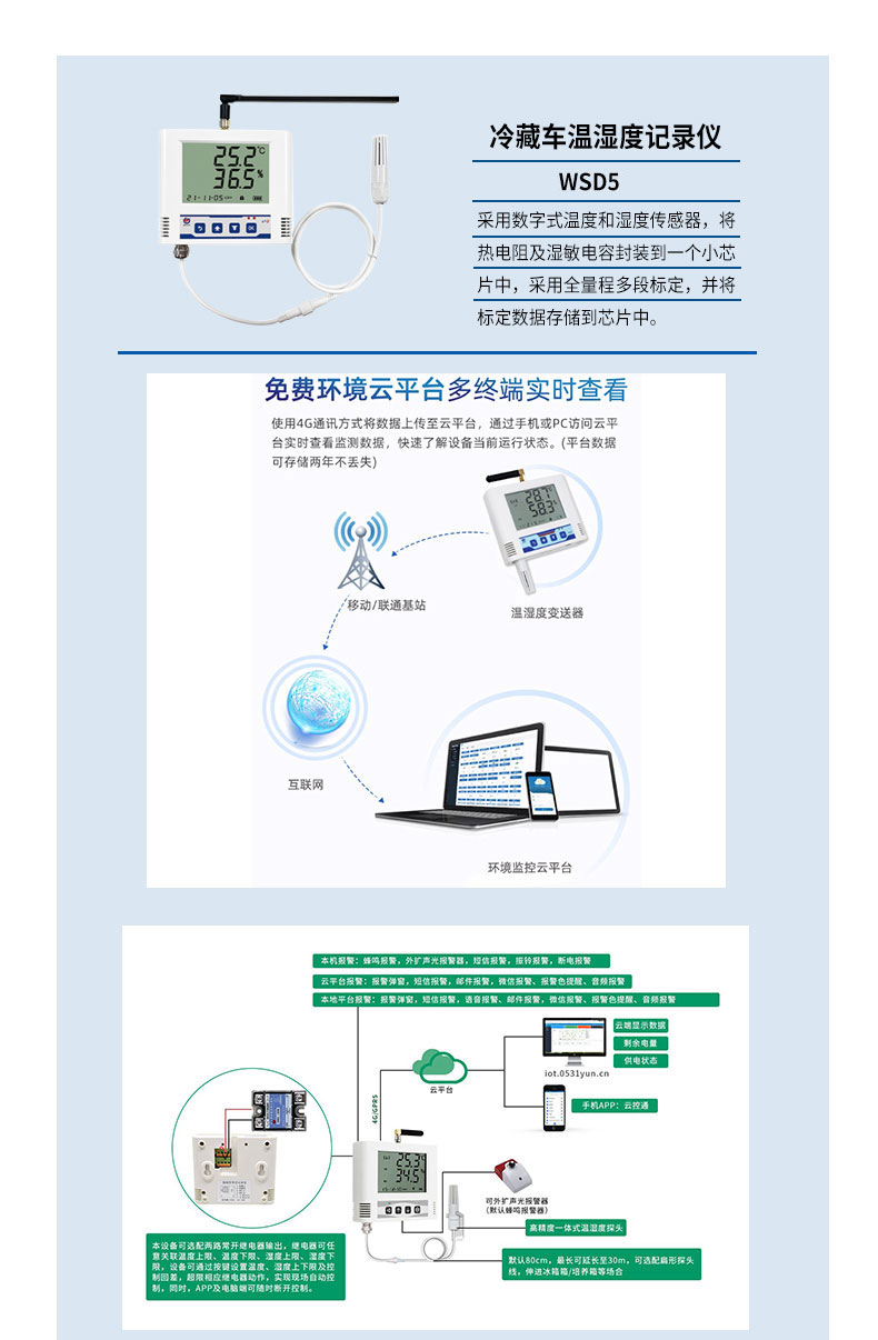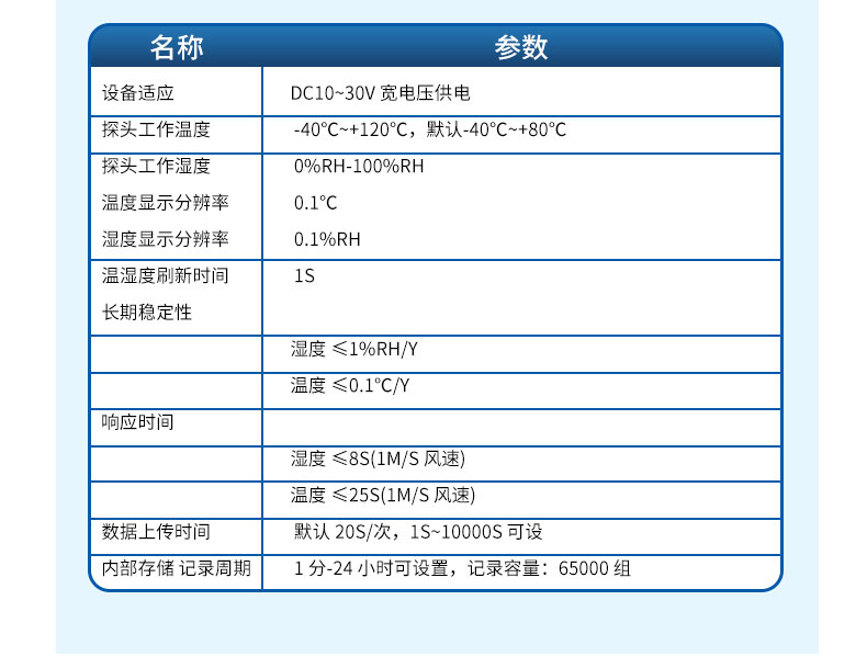 温湿度采集频率 2S/次,数据上传频率 1S~10000S/次可设