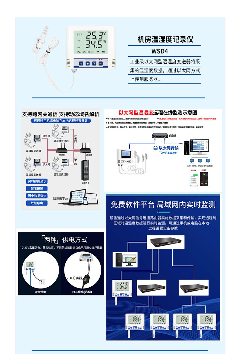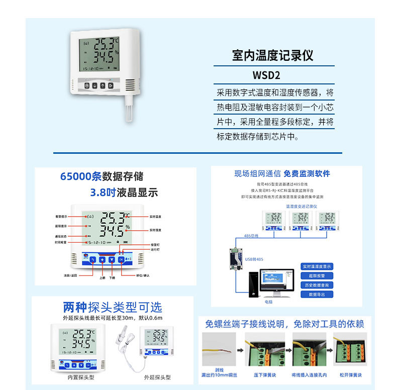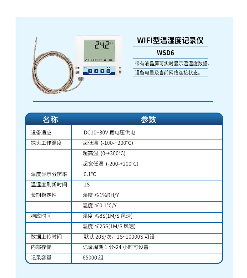 可设内部存储,记录周期:1分-24小时可设置,记录容量:65000组