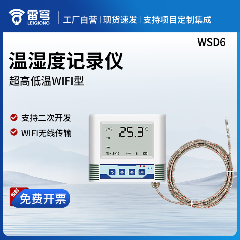 超高低温wifi型温湿度记录仪带有液晶屏可实时显示温湿度数据、设备电量及当前网络连接状态。采用WIFI无线传输,借助现场网络轻松联网上传数据,可选内置电池供电。