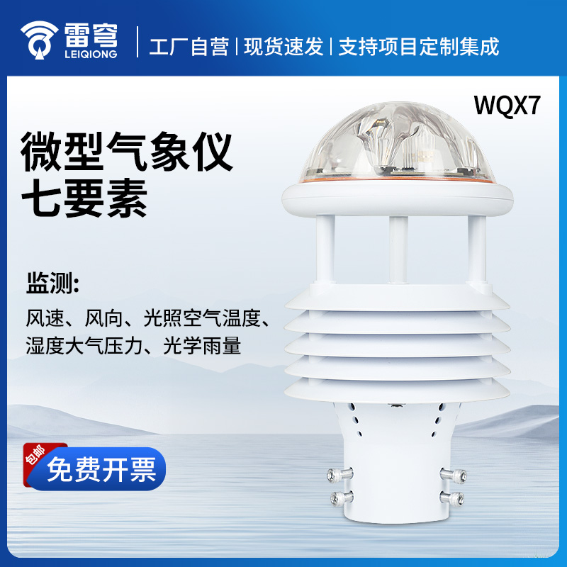七要素微气象仪将气象标准七参数(空气温度、空气湿度、风速、风向、大气压力、光学雨量、光照)过一个高集成度结构来实现,可实现户外气象参数24小时连续在线监测,通过数字通讯接口将七项参数一次性输出给用户。