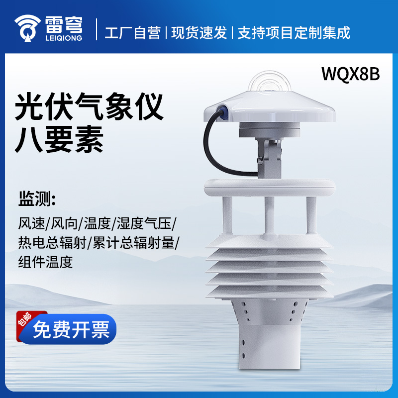 WQX8B型八要素微气象仪创新性地将风速、风向、温度、湿度、气压、热电总辐射、总辐射日累计辐射量、组件温度(背板温度)通过一个高集成度结构来实现,可实现户外气象参数24小时连续在线监测,通过数字量通讯接口将八项参数一次性输出给用户。