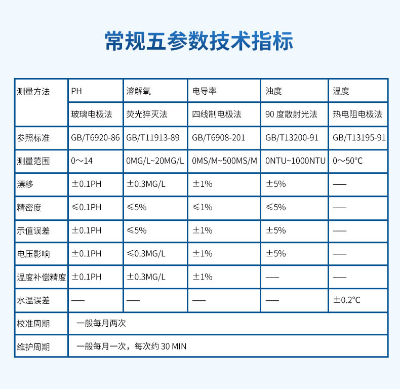 | 测量方法 | pH | 溶解氧 | 电导率 | 浊度 | 温度 |