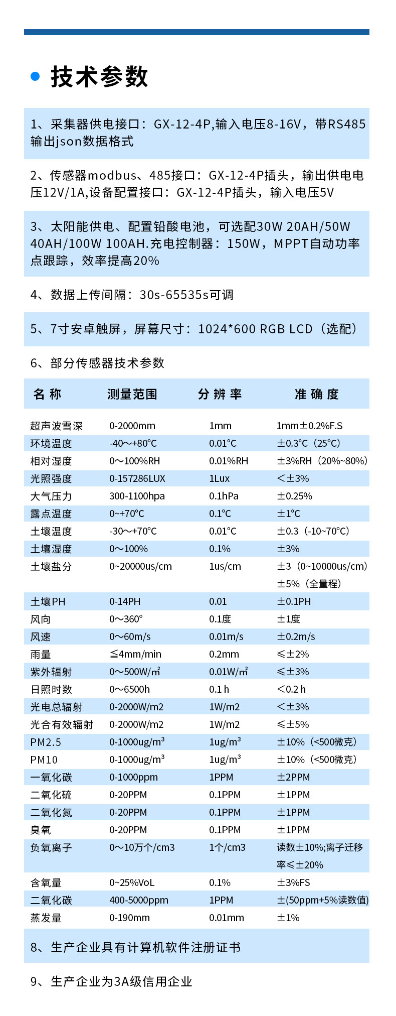 | 光电总辐射 | 0-2000W/m2 | 1W/m2 | <±3% |