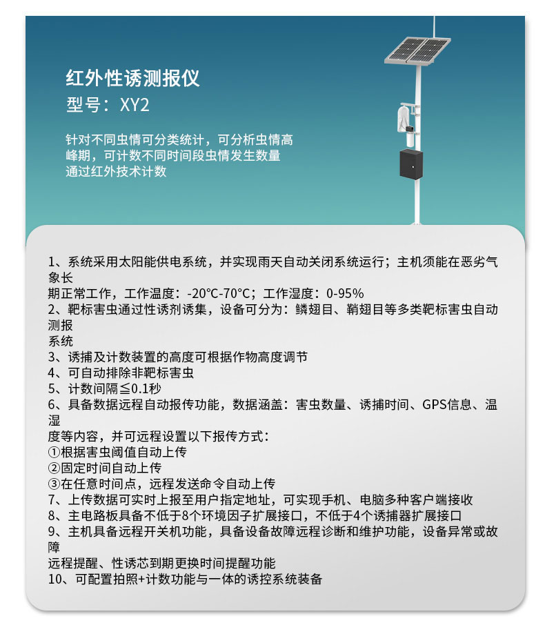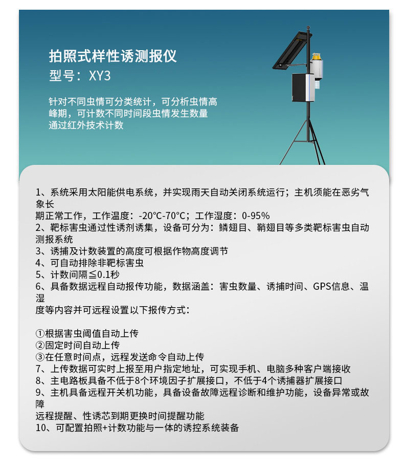 【产品简介】一、拍照式性诱测报仪产品简介我司新型靶标自动监测系统基于边缘计算,可实现害虫定向诱捕,针对不同虫情可分类统计,可分析虫情高峰期,可计数不同时间段虫情发生数量,可拍照靶标,可根据后台···