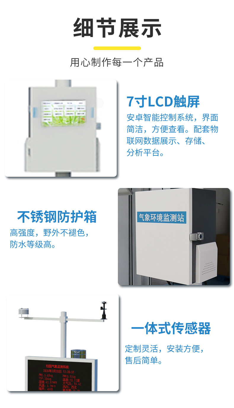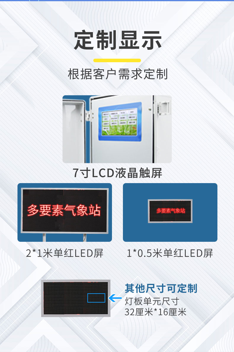 4.硬件组成:传感器、立杆支架、设备箱、LED屏幕、采集器、云平台、玻璃钢百叶箱(内含干湿球温度计)