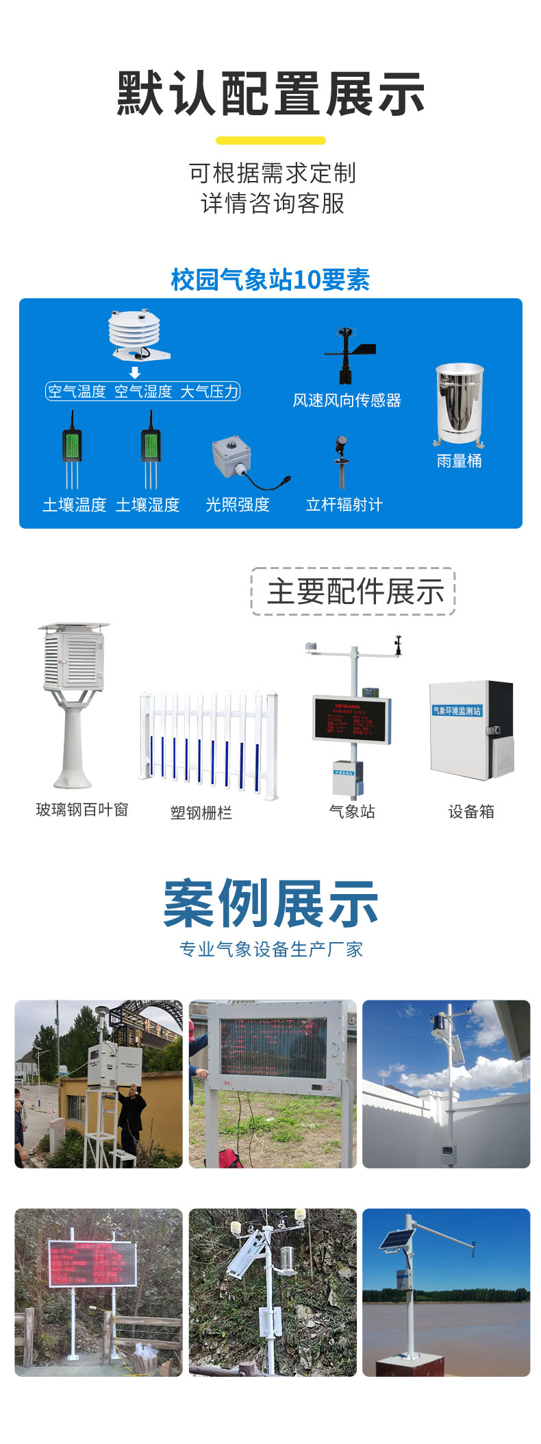 【产品简介】一、小学校园气象站产品简介XQ2小学校园气象站是一款高度集成、低功耗、可快速安装、便于教学使用的科研级气象站。二、小学校园气象站产品特点1.传输方式:GPRS,可选配有线传输;2.···