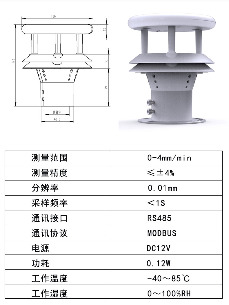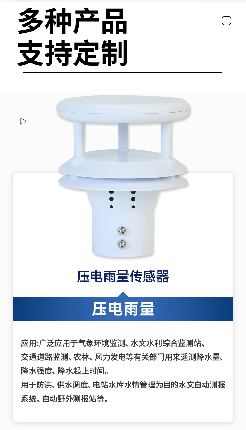 【产品简介】一、压电雨量传感器产品概述压电雨量传感器采用PVDF压电薄膜作为感雨器件,通过嵌入式AI神经网络分辨雨滴信号,避免因砂砾、灰尘、振动等干扰带来误触发。广泛应用于气象环境监测、水文水···