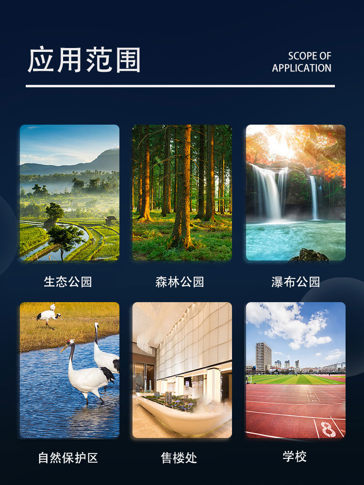 旅游景区、生态庄园、湿地公园、瀑布公园、森林公园、自然保护区、售楼处、学校
