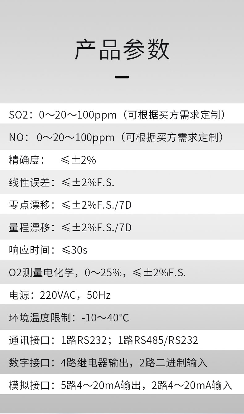 量程漂移 | 不超过±1%F.S | 电压影响 | 分析仪读数变化不超过±2%F.S. |