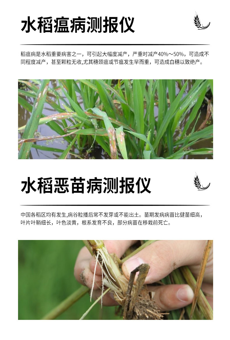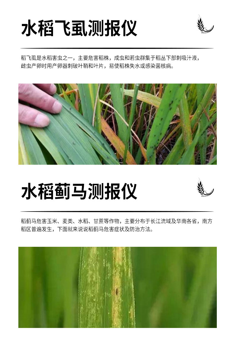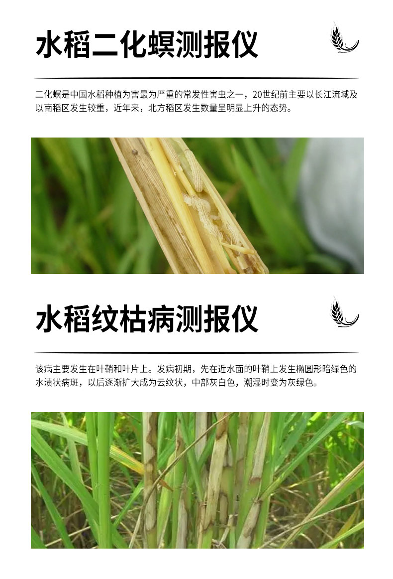 稻蓟马为害水稻叶片,影响水稻的光合作用,造成产量减少。稻蓟马测报仪根据稻蓟马对特定颜色敏感的原理研制而成,设备集自动调节色板的高度、自动旋转、自动拍照、自动上传数据为一体,同时还对气象数据进行一体化监测,以研究稻蓟马的爆发与气象的关系。