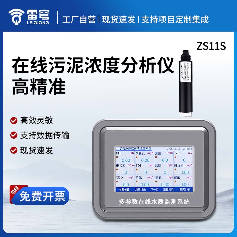 ZS11S在线污泥浓度计是一种能够在线监测水质污泥浓度的仪器。它集成了水质悬污泥浓度传感器和测量模块通讯存储,能够快速、准确地记录水体中的关键参数。同时,仪器支持扩展水质多参数传感器,包括但不限于水质悬浮物、氨氮、ORP、pH值、溶解氧(DO)、电导率、浊度、温度等,可以根据不同的需求和应用进行组合和配置,记录并存储历史监测数据、报警历史记录,支持历史数据导出.xlsx。RS485接口支持MODBUS-RTU通讯协议方便用户自由通讯与PLC、DCS,组态软件,DTU等设备连接传输数据。
