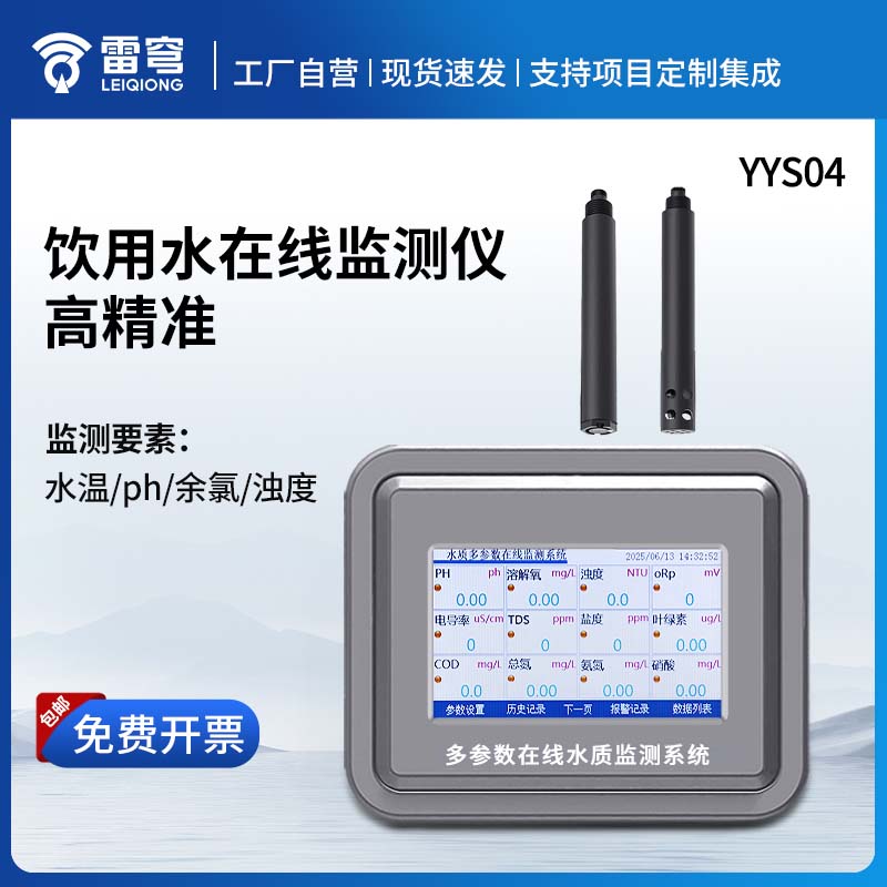YYS04在线饮用水在线监测仪是一种能够在线监测水温、ph、余氯、浊度的仪器。它集成了对应的传感器和测量模块通讯存储,能够快速、准确地记录水体中的关键参数。同时,仪器支持扩展水质多参数传感器,包括但不限于pH值、溶解氧(DO)、电导率、浊度、温度、氨氮等,可以根据不同的需求和应用进行组合和配置,记录并存储历史监测数据、报警历史记录,支持历史数据导出.xlsx。RS485接口支持MODBUS-RTU通讯协议方便用户自由通讯与PLC、DCS,组态软件,DTU等设备连接传输数据。
