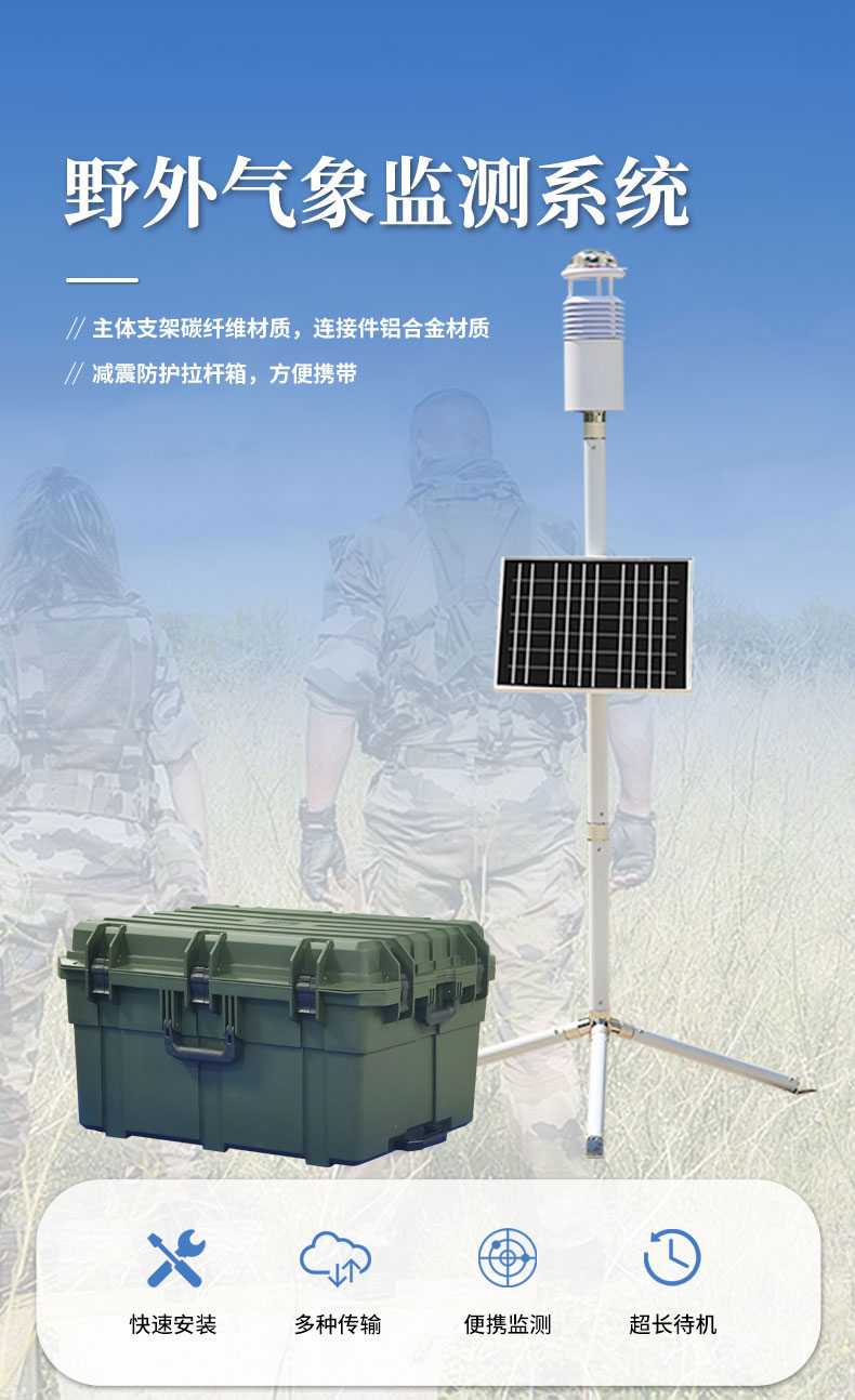 【产品简介】一、碳纤维气象站产品简介碳纤维气象站是一款高度集成、低功耗、安装、便于野外监测使用的高精度便携式气象站。主体支架为碳纤维材质,重量为钢制的四分之一,强度为钢制的五倍。我公司针对客户···