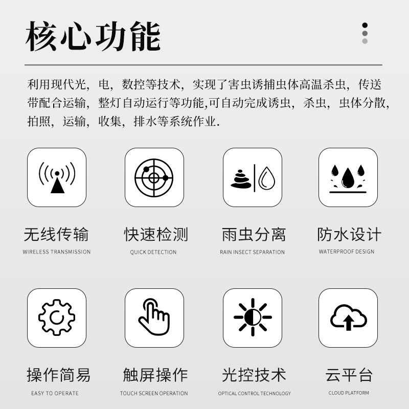 工作原理:利用现代光,电,数控等技术,实现了害虫诱捕虫体高温杀虫,传送带配合运输,整灯自动运行等功能。在无人监管的情况下,可自动完成诱虫,杀虫,虫体分散,拍照,运输,收集,排水等系统作业,然后利用无线传输技术、物联网技术并实时将环境气象和虫害情况上传到指定农业云平台。