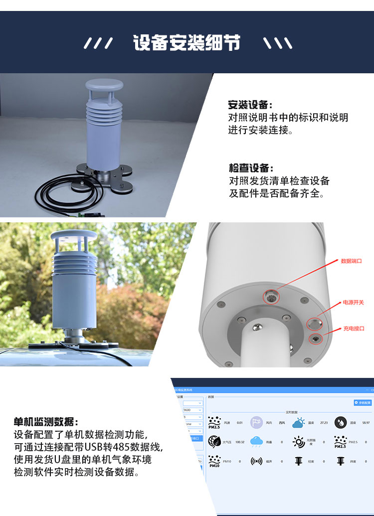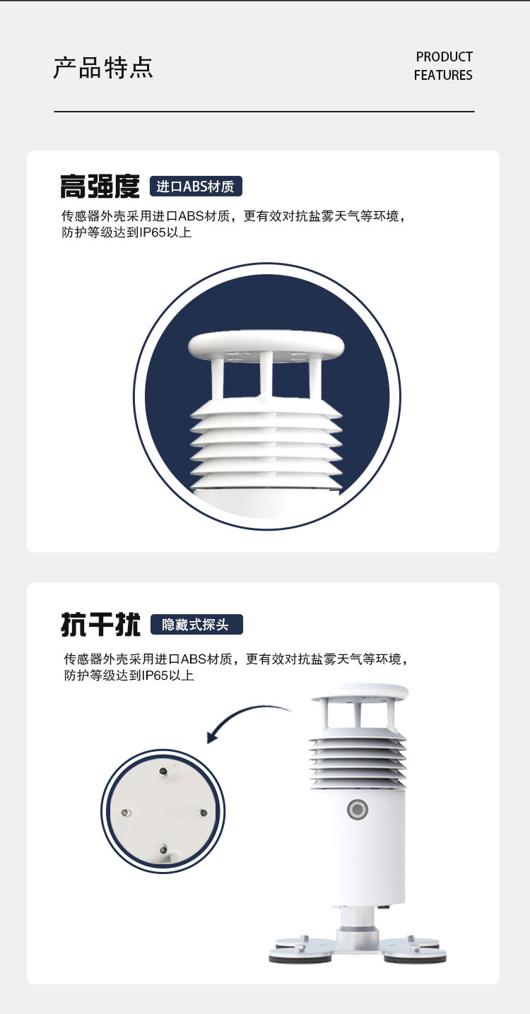 该设备采用五要素一体式传感器,可对风速、风向、空气温度、湿度、大气压力等气象要素进行实时观测,传感器外壳采用进口ABS材质,更有效对抗盐雾等环境,防护等级达到IP65以上。