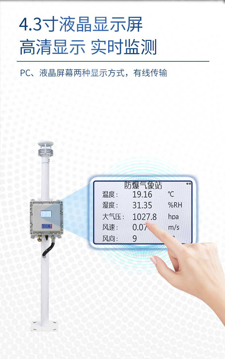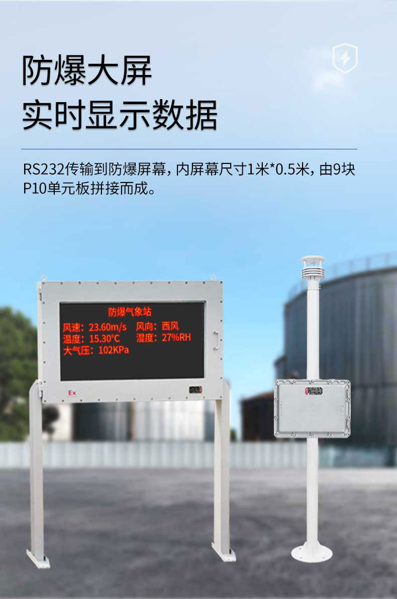 防爆气象站是山东雷穹根据市场需求,针对化工厂、油库等特殊场所而研发生产的一款一体化气象站。它集数据采集、存储、通讯上传于一体,通过有线的通讯方式与后台上位机管理软件或者中控室PLC、DCS对接,进行数据的处理分析。