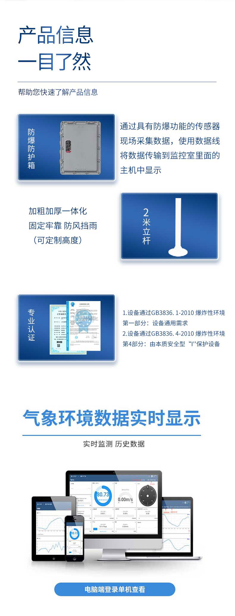 【产品简介】一、防爆气象站产品简介防爆气象站是山东雷穹根据市场需求,针对化工厂、油库等特殊场所而研发生产的一款一体化气象站。它集数据采集、存储、通讯上传于一体,通过有线的通讯方式与后台上位机管···