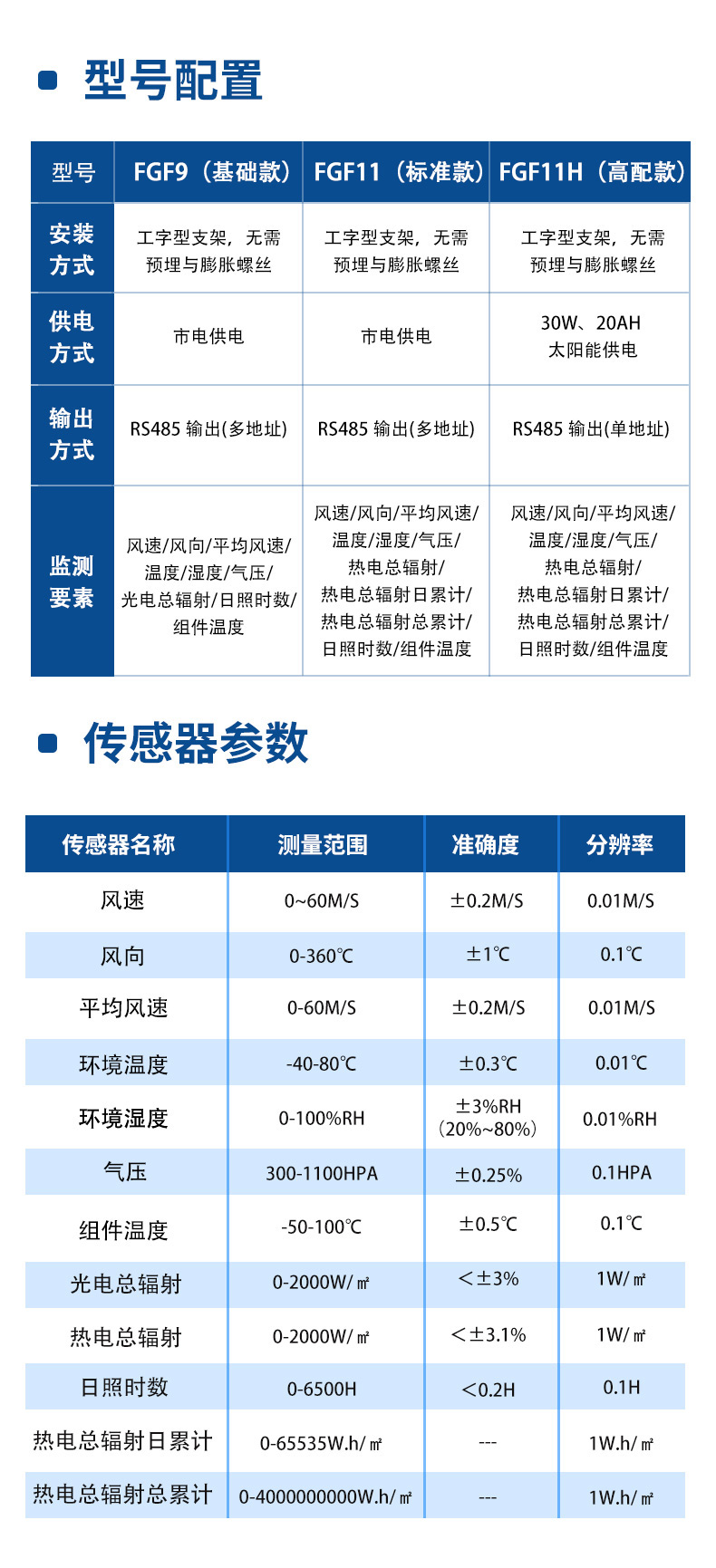 | 监测要素 | 风速、风向、平均风速、温度、湿度、气压、光电总辐射、日照时数、组件温度 | 风速、风向、平均风速、温度、湿度、气压、热电总辐射、热电总辐射日累计、热电总辐射总累计、日照时数、组件温度 | 风速、风向、平均风速、温度、湿度、气压、热电总辐射、热电总辐射日累计、热电总辐射总累计、日照时数、组件温度 |