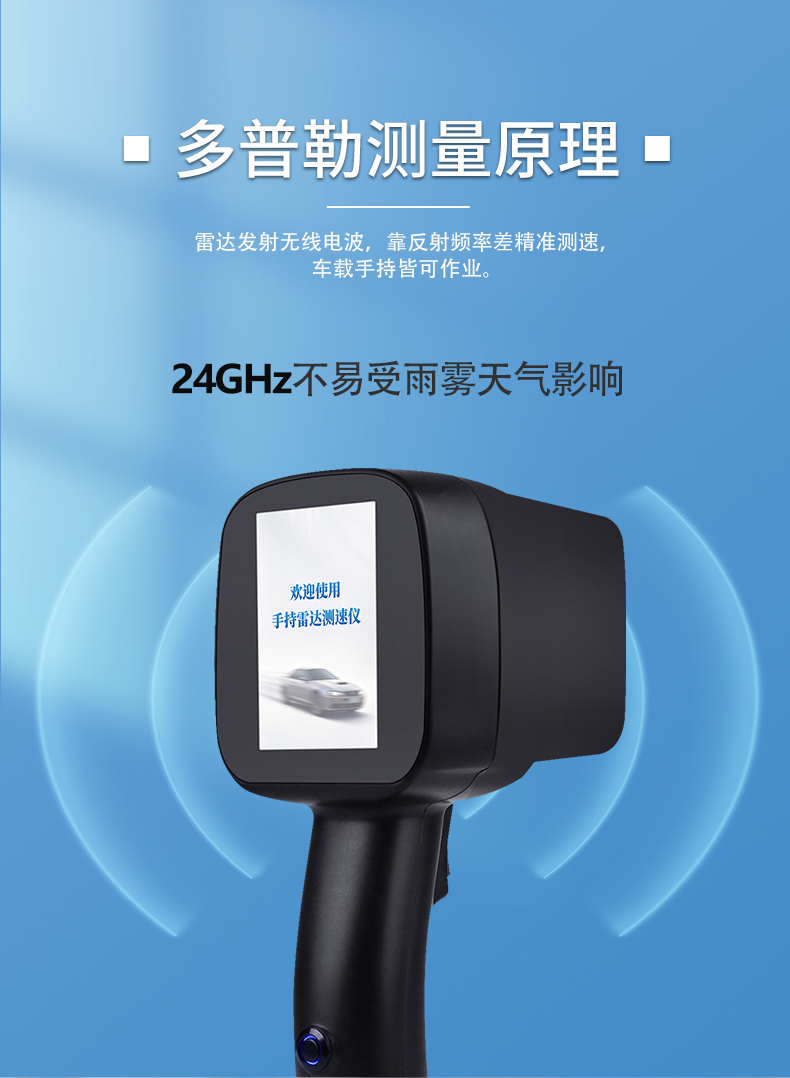 手持式雷达测速仪依据多普勒效应,通过向车辆方发出无线电波,当电波的能量撞击车辆时,波的能量一小部分返回雷达设置天线;根据返回信号频率不同,测定车辆速度,支持车载动态测速。