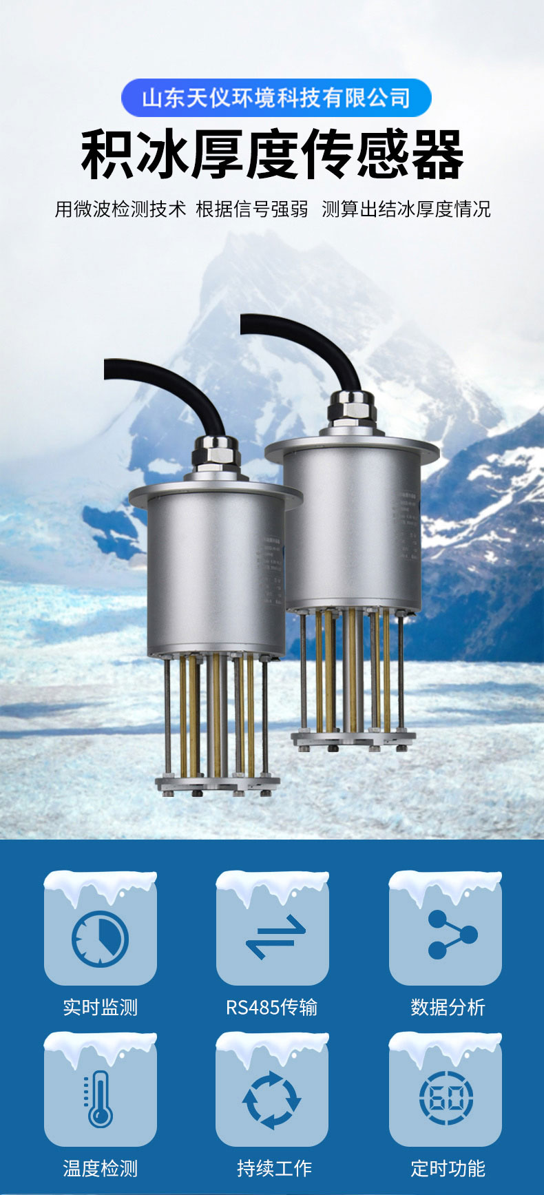 本积冰传感器采用微波检测技术,基于微波信号对冰、水、空气等不同物质的反馈信息的区别实现对传感器敏感区域的结冰信息的监测,并根据信号的强弱以及传感器区域结冰的分布信息进行结冰厚度计算。本产品一般安装于电线塔上,通过测量本传感器上的积冰情况,即可对等判断出当前电线塔附近的电线积冰情况。