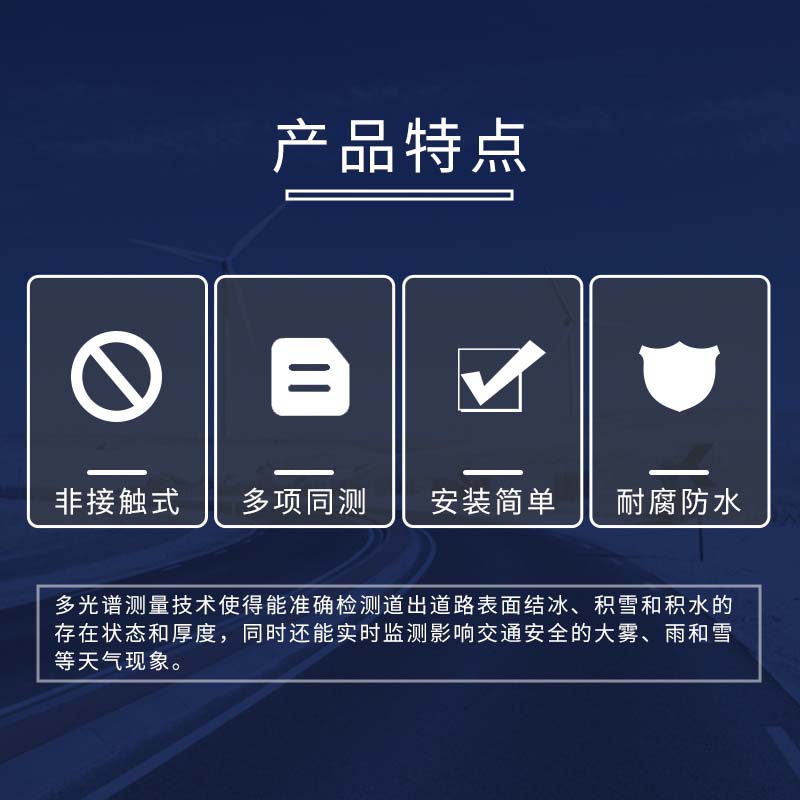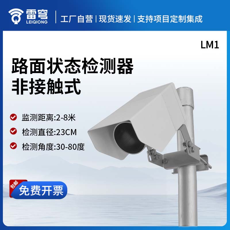 LM1系列路面状况传感器,它采用遥感技术,避免了对道路的破坏,从而不会因为安装道路气象站引起的对交通的干扰。多光谱测量技术使得能准确检测道出道路表面结冰、积雪和积水的存在状态和厚度,同时还能实时监测影响交通安全的大雾、雨和雪等天气现象。