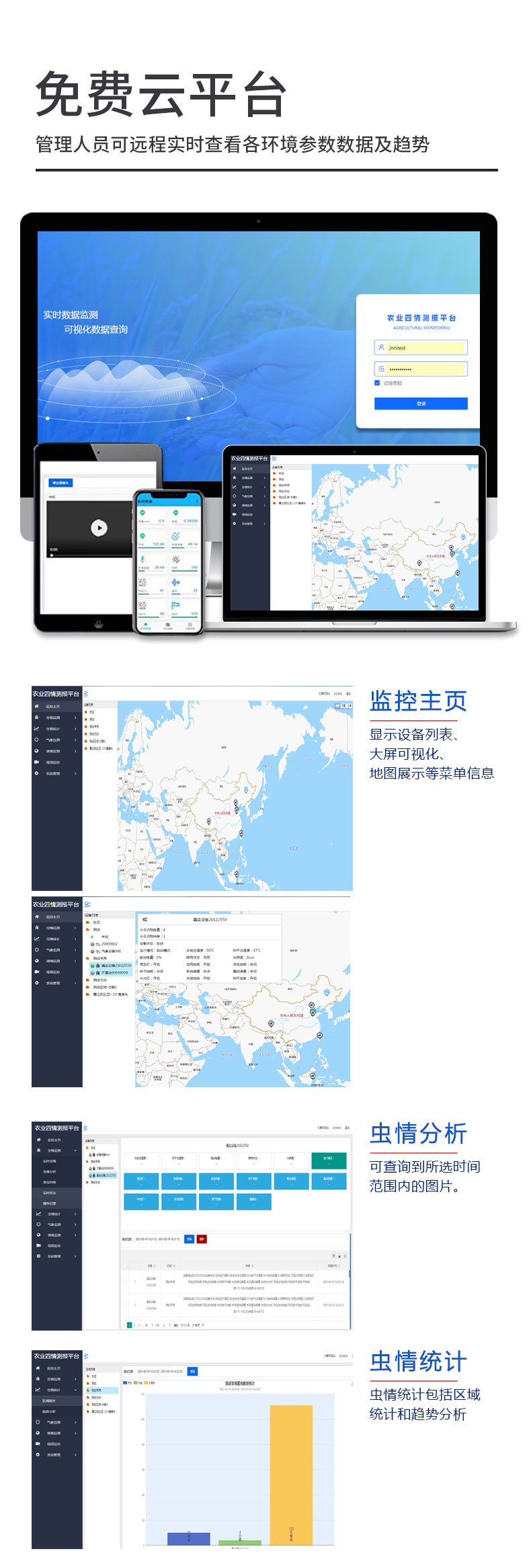 1.农业四情测报平台是集虫情、气象、墒情、苗情、孢子监测为一体在线监控平台。虫情监测具有Al害虫自动识别、远程实时查看虫情、虫情在线分析、害虫种类自动识别、区域虫情统计、虫情变化趋势分析、设备监测等功能。气象监测具有远程实时查看气象、在线分析气象历史数据的功能。墒情监测具有远程获取土壤墒情(如土壤温湿度、水分、PH)数据、在线分析土壤墒情历史数据的功能。苗情监测可实时查看作物长势画面。孢子自动捕捉仪采用光、电、数控技术,自动显微成像全天候对所捕获的病菌孢子自动拍摄。智能孢子捕捉设备包过高倍光学显微成像系统,精度限位技术、自动智能化聚焦融合技术、物联网传输控制技术等技术手段,并实时将空气中孢子图片上传到指定农业云平台。