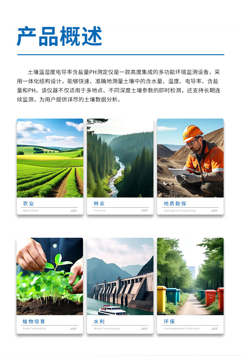 【产品简介】一、土壤电导率含盐量测定仪产品简介土壤电导率含盐量测定仪是一款高度集成的多功能环境监测设备,采用一体化结构设计,能够快速、准确地测量土壤中的电导率、含盐量。该仪器不仅适用于多地点、···