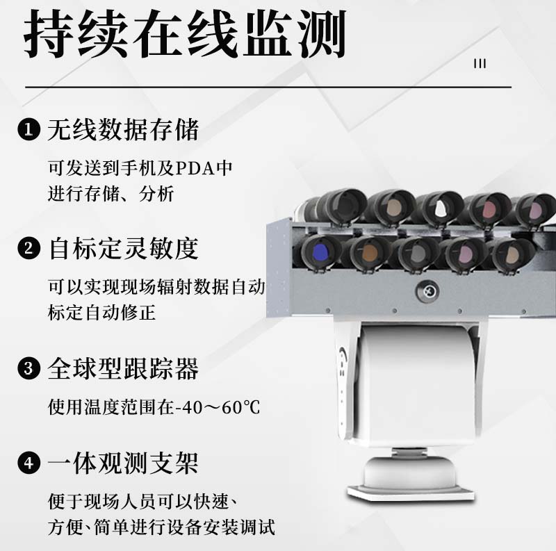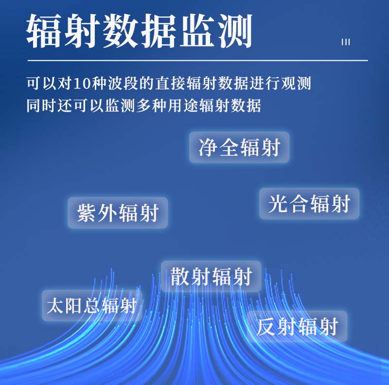 1、辐射数据监测:可以对10种波段的直接辐射数据进行观测,同时还可以监测太阳总辐射、散射辐射、反射辐射、紫外辐射、光合辐射、净全辐射等多种用途辐射数据。