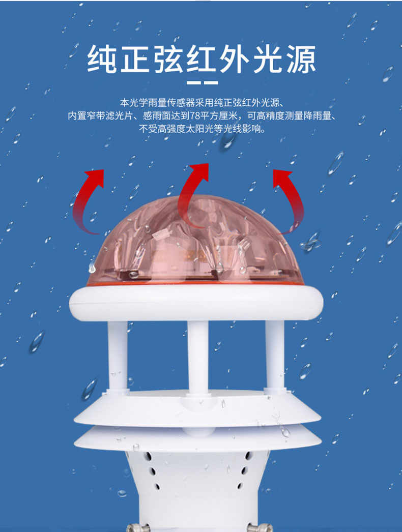 1.本光学雨量传感器采用纯正弦红外光源、内置窄带滤光片、感雨面达到78平方厘米,可高精度测量降雨量、不受高强度太阳光等光线影响。高透光率感雨罩不影响直射的太阳光,可兼容内置其他光学传感器,如光照、总辐射、紫外线传感器等