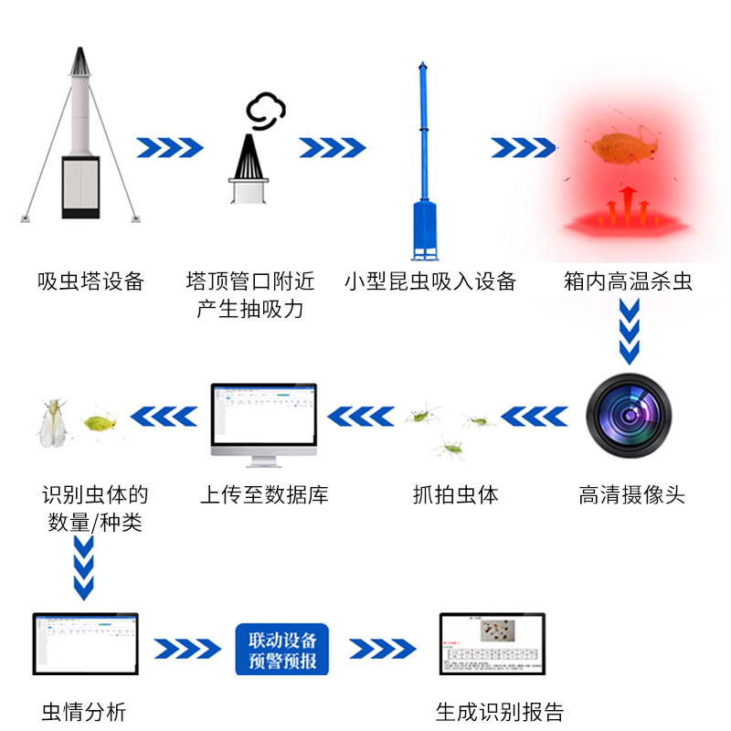 由设备基部风机的抽吸,在塔顶管口(吸虫塔高8.3 m)附近产生抽吸力,将途经或在塔顶附近活动的小型昆虫吸入设备基部(收集口滤网过滤大型害虫、增加防鸟防雨帽,保证雨水不会进入机器内部)的样本收集盘上,由摄像机进行拍照(30分钟拍照一次),图片传输到云端服务器,经过AI数据识别处理后自动计数和统计虫体种类,监控人员可以通过PC端和手机APP远程查看和统计目标昆虫的种类和数量,以此获得昆虫的实时及准确的种群动态信息。在无人监管的情况下,可自动完成诱虫,杀虫,虫体分散,拍照,运输,收集,排水等系统作业,然后利用无线传输技术、物联网技术并实时将环境气象和虫害情况上传到指定农业云平台,对虫害的发生与发展进行分析和预测,为现代农业提供服务,满足虫情预测预报及标本采集的需要。